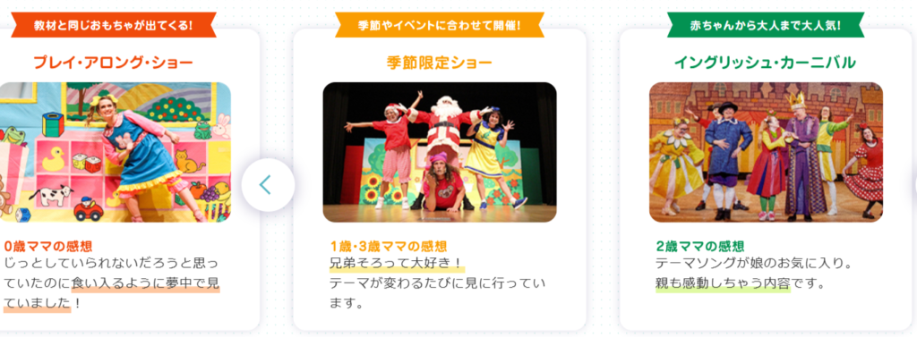 ショーをただ見るだけでなく、教材で覚えた歌やフレーズを会場のみんなで一緒に歌ったり、踊ったりしてアウトプットもばっちり!さらにネイティブの先生と話すことも出来るので英語を話す練習にもなりそうだなと思いました。